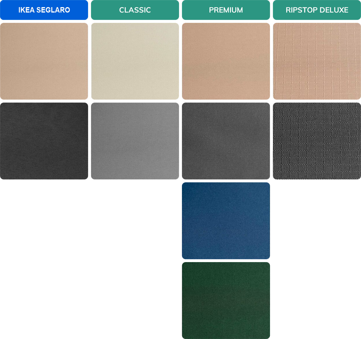 Die Stoff Qualität unterscheidet sich je nach Stoff Art und UV Behandlung. Die Stoffart bei Classic und Premium ist ein Standard Polyester Gewebe und bei Ripstop wird dieser noch zusätzlich verstärkt genäht, wodurch der Stoff nicht nur optisch einen höherwertigen Eindruck erhält, sondern er ist ebenso noch reißfester und strapazierfähiger.